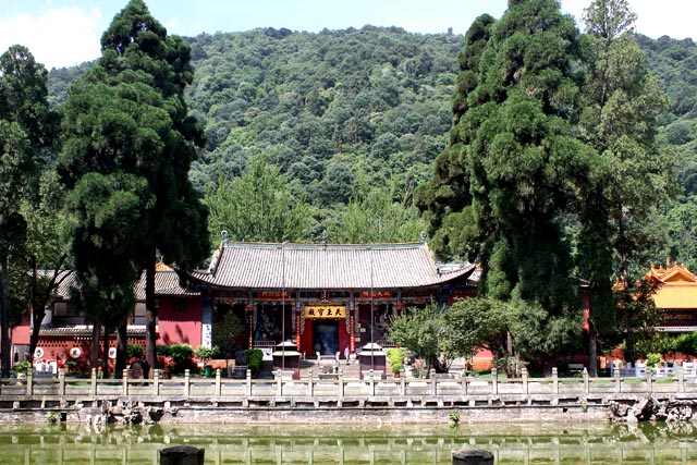 The mountain behind and the pond of water in front makes the perfect feng shui at Huating Temple, Kunming, Yunnan. The site im Xishan Mountain Forest Park was a nobleman's villa in 1063; the temple was dedicated in 1320. What we see today is the result of efforts by Master Xuyun, who became abbot in 1918.
